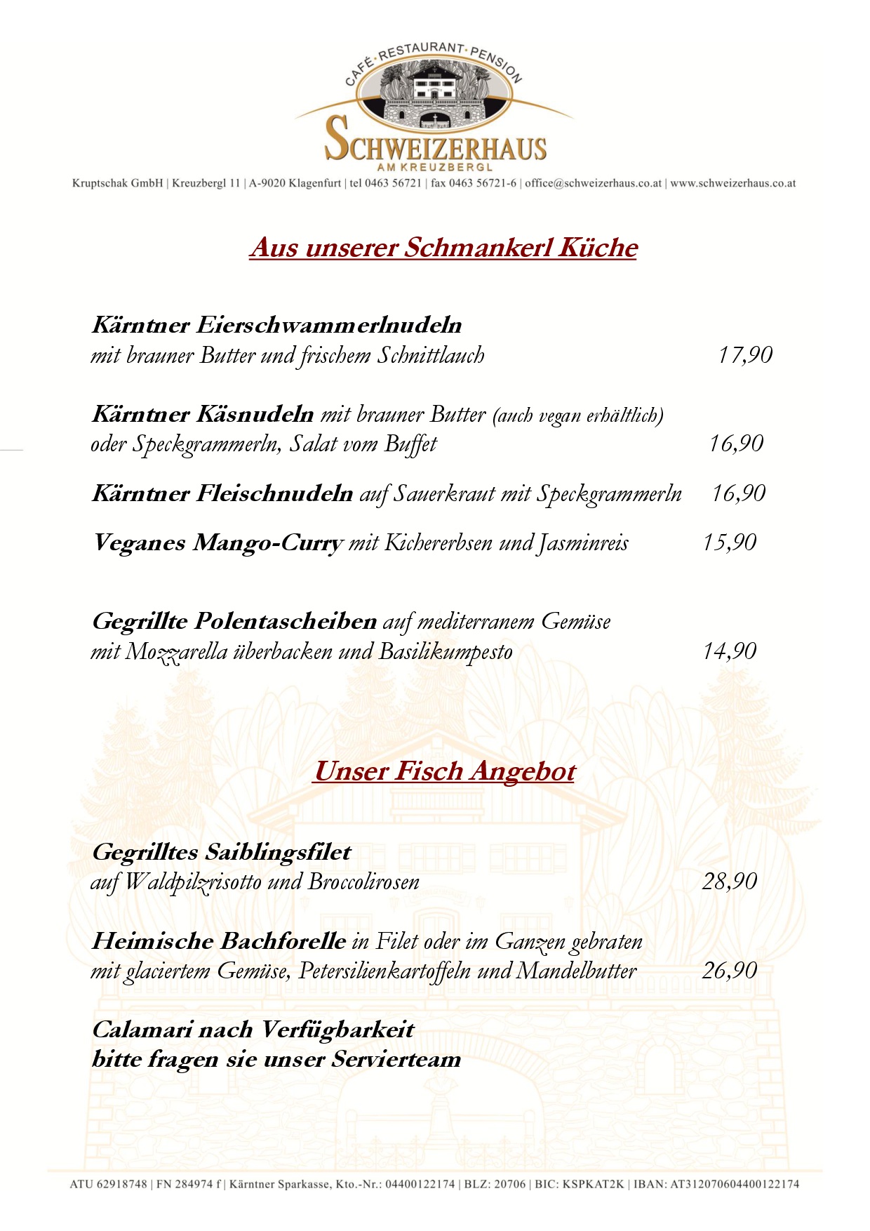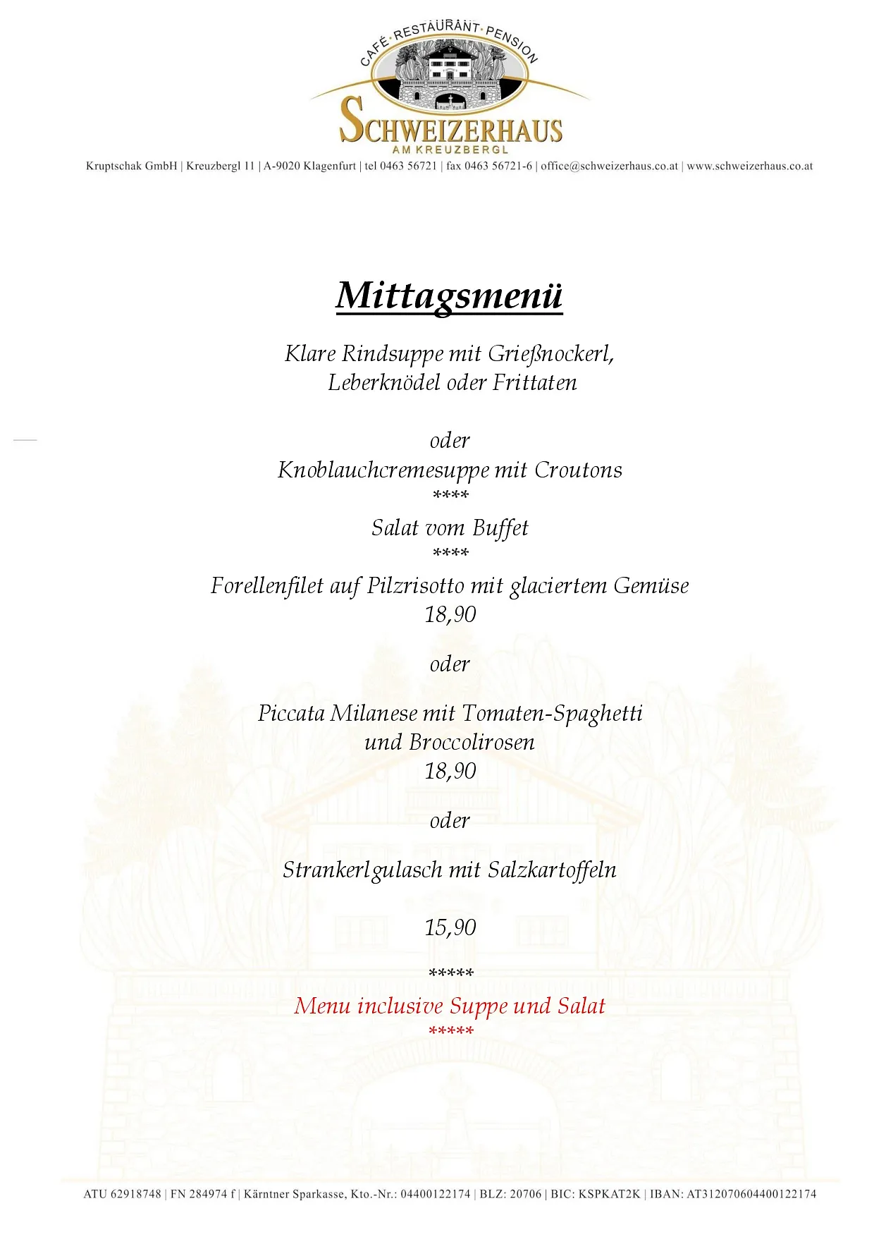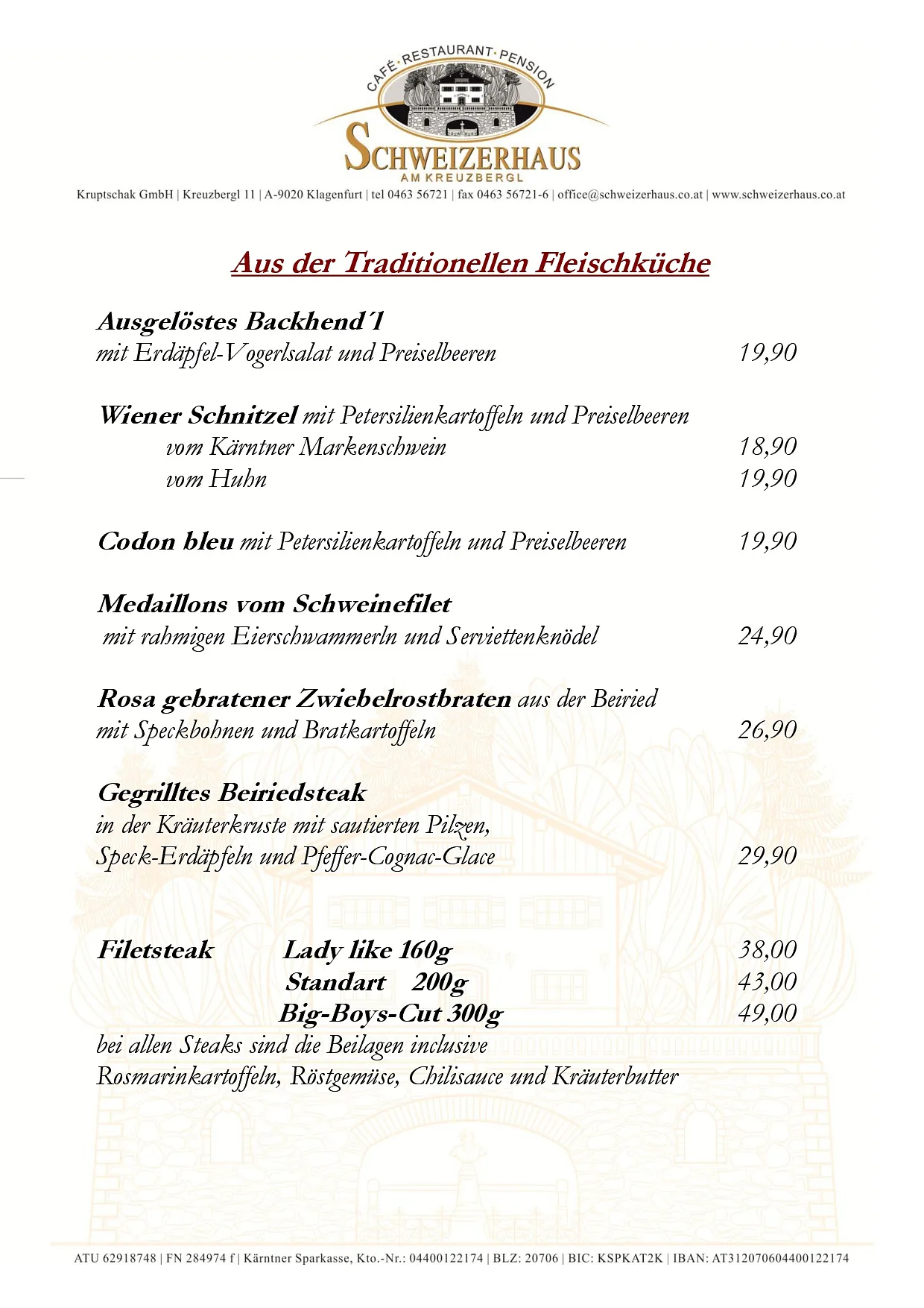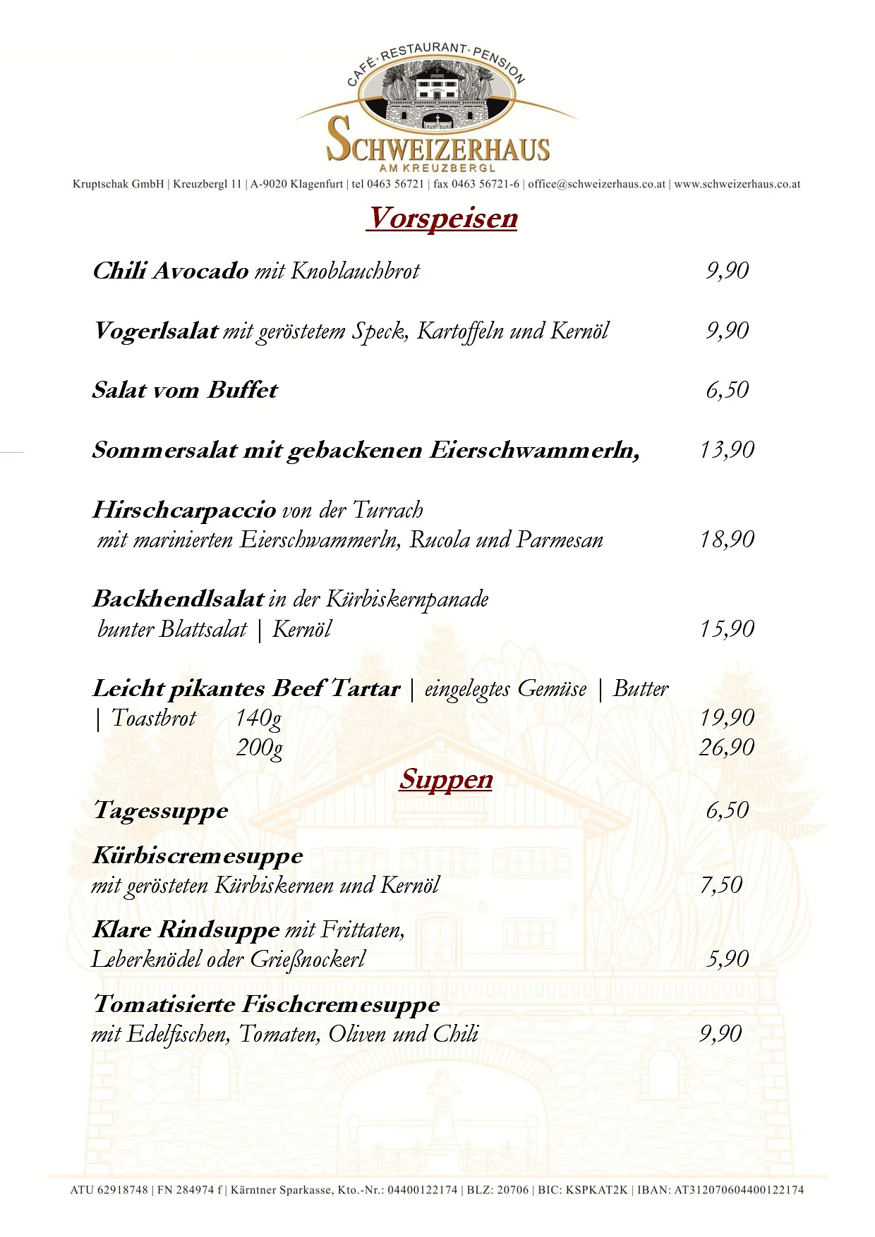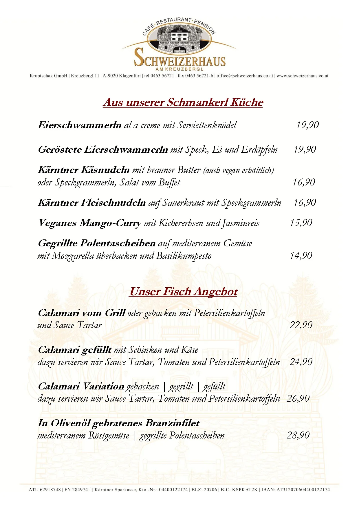 Die Speisekarte des Schweizerhaus Klagenfurt am Kreuzbergl in Klagenfurt am Wörthersee