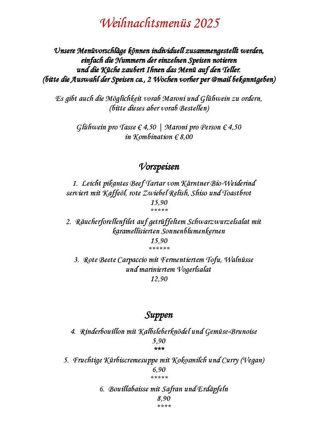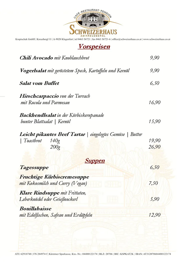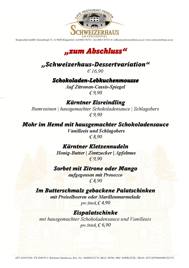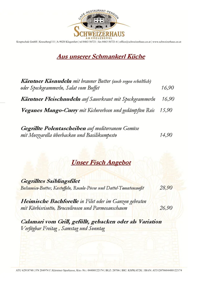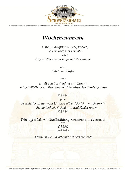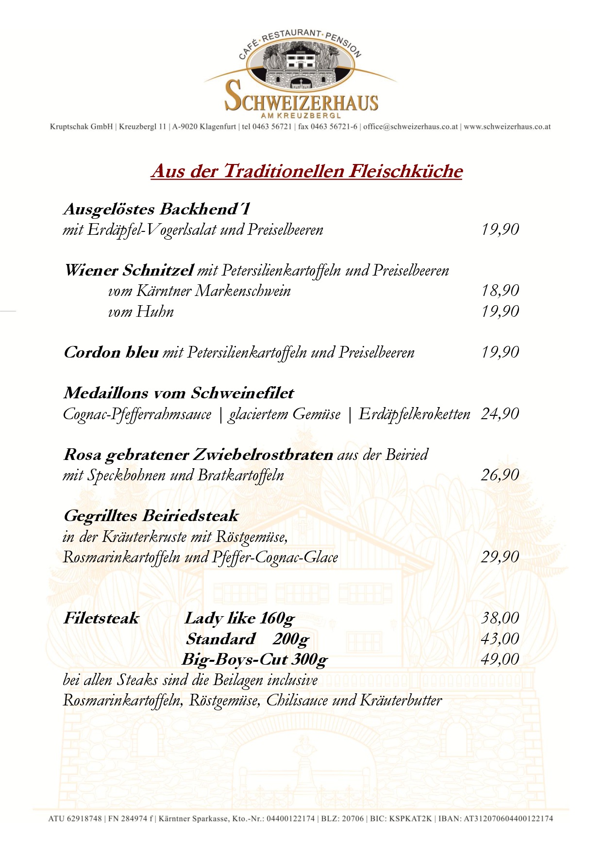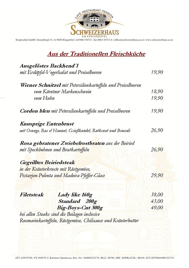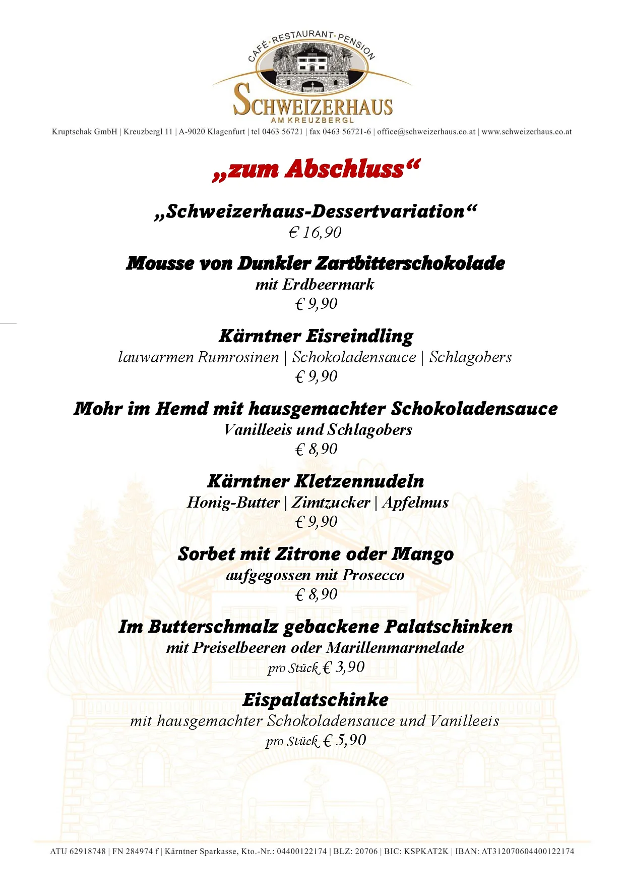 Die Speisekarte des Schweizerhaus Klagenfurt am Kreuzbergl in Klagenfurt am Wörthersee